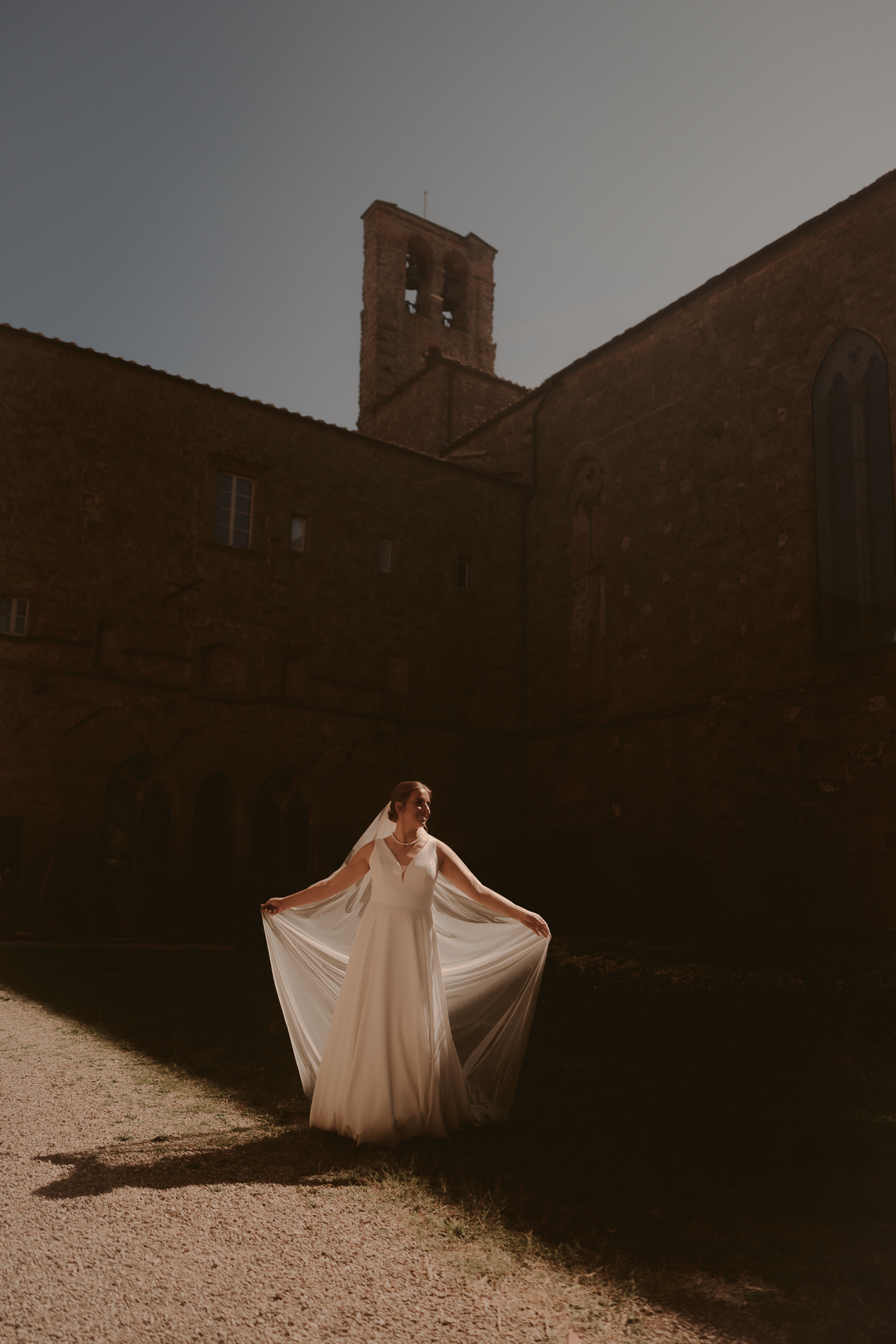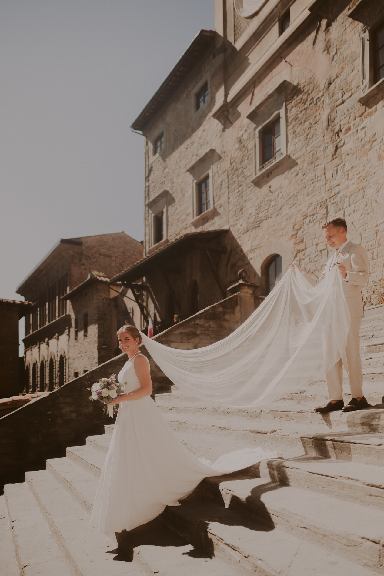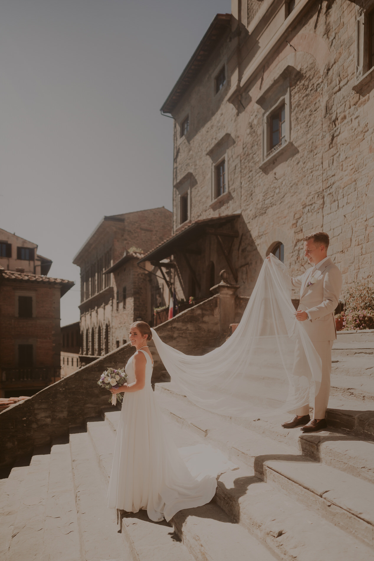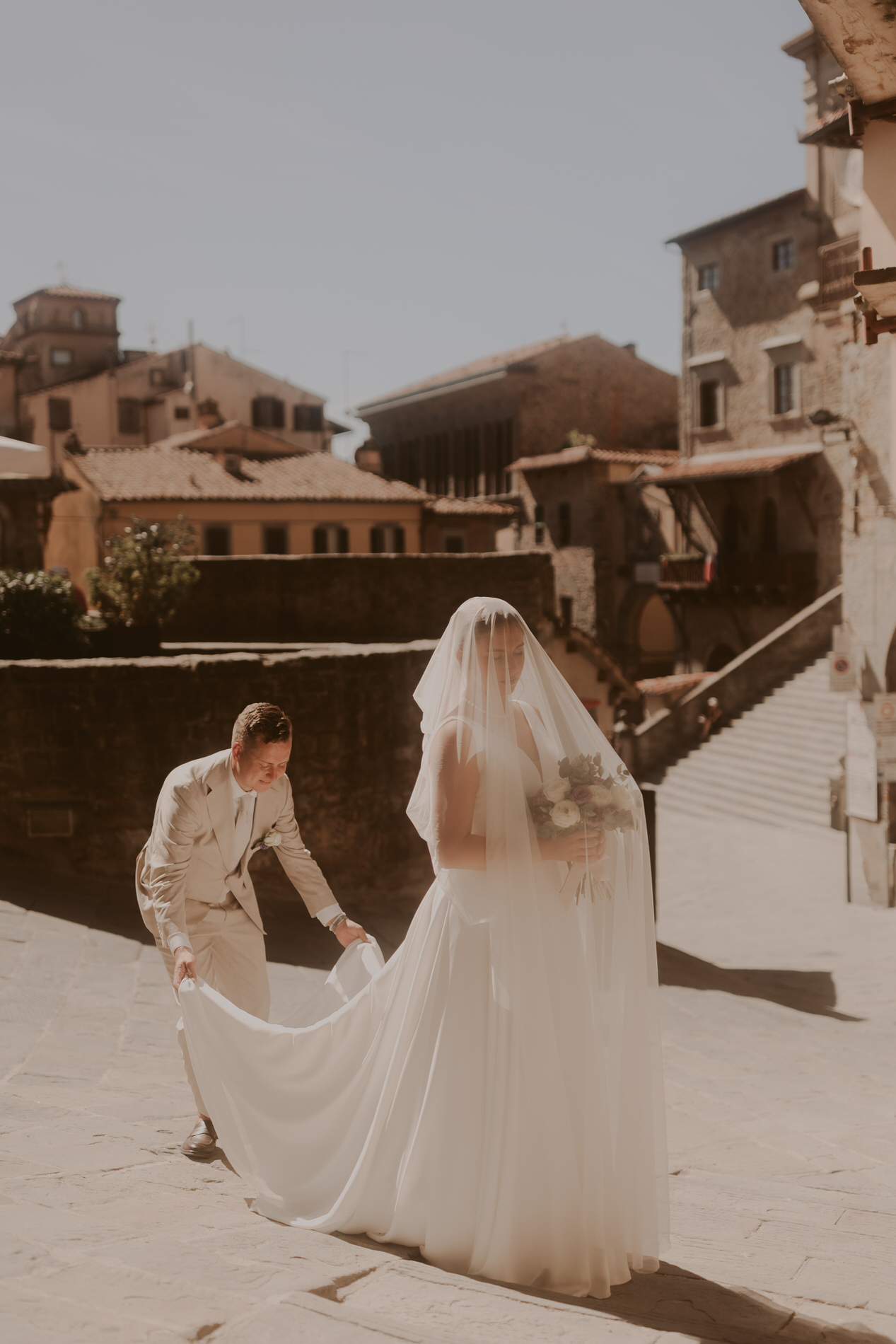 Seuraavana päivänä oli kauan odotettu hääpäivä. Aamu alkoi valmistautumisten valokuvaamisella juhlapaikan villalla (Monestaro San Silvestro). Ensimmäiset kuvat päätin ottaa upeassa sivurakennuksessa, jossa oli todella hieno kaareva katto sekä se toi kuviin heti sen ensimmäisen erityisen tunteen. Muotokuvat päätimme ottaa hieman "riskivaihtoehtona" Cortonan vanhassakaupungissa. Se on riski, koska luonnollisesti päivällä on lämmin, ihmisiä on paljon liikkeellä sekä liikkuminen autolla voi aina tuoda yllättyksiä matkaan. Kuitenkin en halunnut "vain" kuvata lähellä villaa, vaan saada kuviin valon, varjot sekä aidon Italian arkkitehtuurin. Se oli ehdottomasti oikea ratkaisu ja saatiin kuviin aivan uskomaton tunnelma. Kävin katsomassa paikkoja etukäteen sekä löysin muutaman "vilkaamman", mutta näyttävämmän lokaation, kuin hiljaisemman ja turvallisen kohdan. Lopuksi saatiin kaunis yhdistelmä molempia sekä erityisesti eräässä pihassa oli aivan tajunnanräjäyttävä valo, jota ihannoin yhä vieläkin tätä kirjoittaessa.
